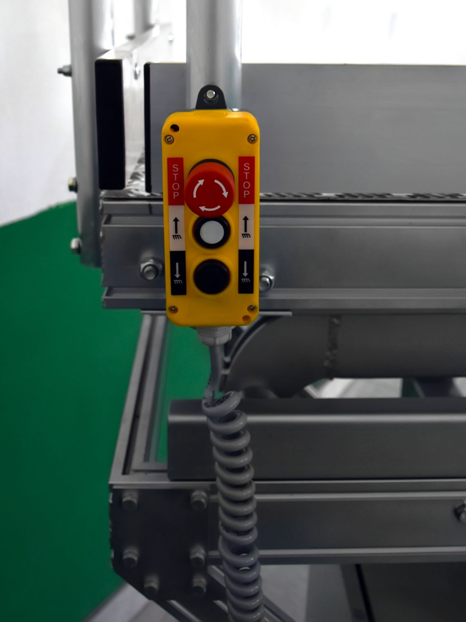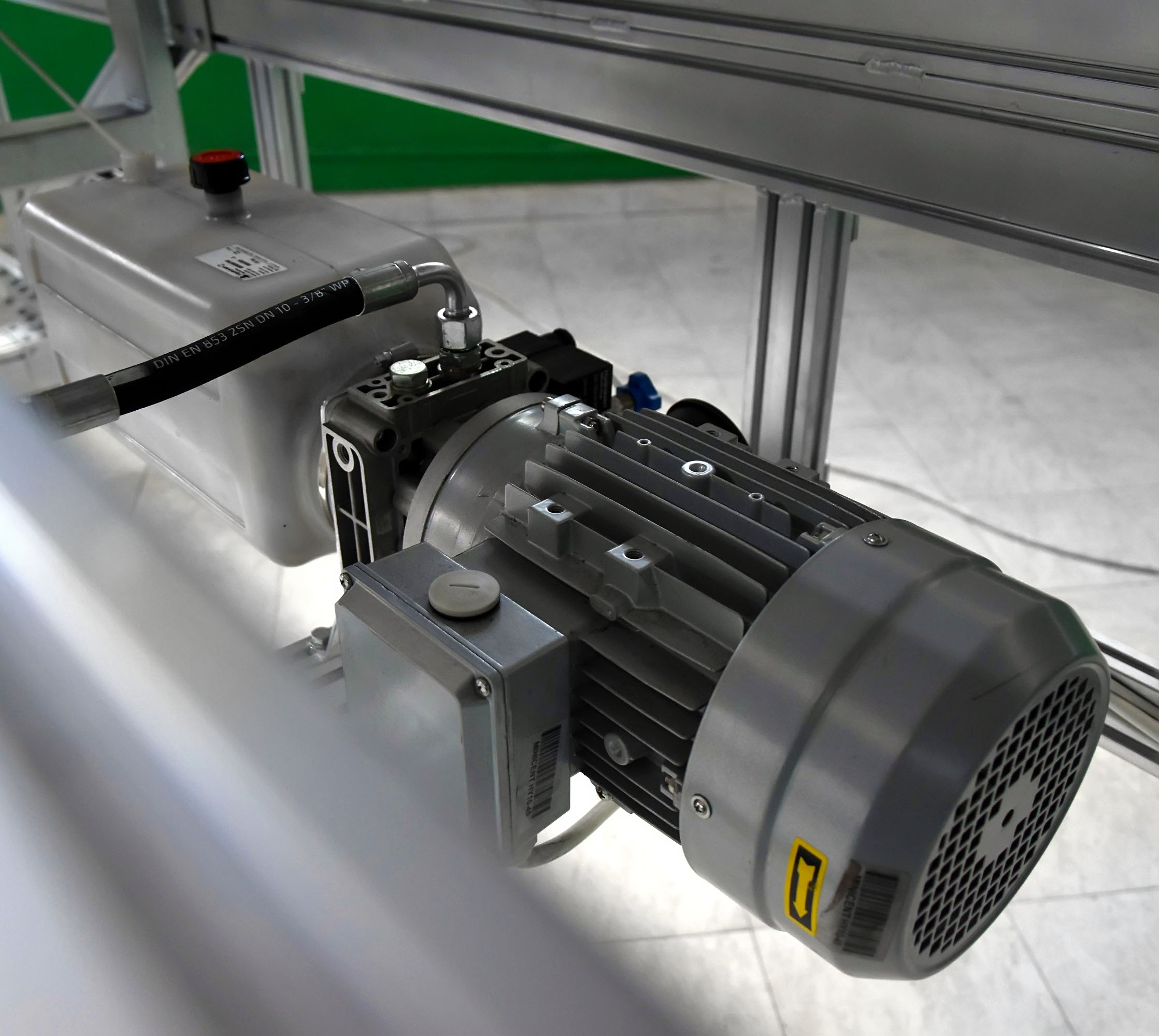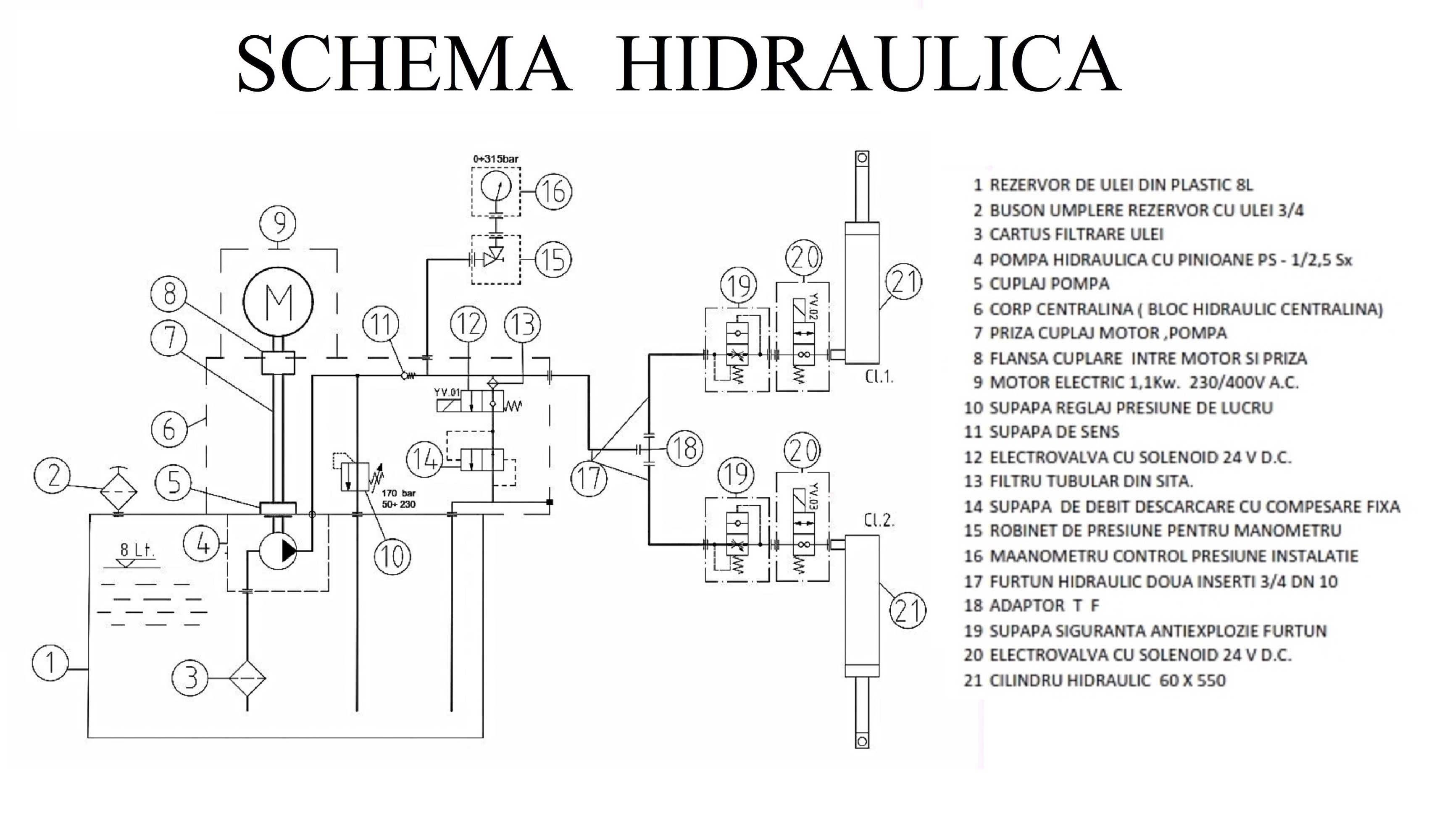 - cablaj electric cu limitatoare de protectie - 2 cilindrii hidraulici - motor trifazat de 1,1 kw - pompa hidraulica de 175 bari - rezervor de 8 litri cu filtru aferent - electrovalve de comanda pistoane si de coborare - rodineti de protectie (150 bari), descarcare si retinere - supape siguranta la rupere furtune - altele (manometru, furtune etc) - viteza de ridicare/coborare podina de 3 ori mai mare Detalii produs: *Lungime podina: 4610 mm •Latime podina: 650 mm •Înaltiime minima podina(H min): 1450 mm •Înaltime maxima podina(H max): 2500 mm *Lungime cursa de ridicare max: 1050 mm *Înaltime balustrade: 1.100 mm •Unghi de înclinare scara: 45° •Lungime baza: 1200 mm •Sarcina de suprafata admisa: 150 kg/m² •Sarcina totala maxima pe podina: 500 kg *Sarcina statica/dinamica pe fiecare roata: 1.200/600 kg *Viteza de ridicare.: 1,05 metri in 18 secunde (3,5m/min) *Viteza de coborare: 1,05 metri in 14 secunde (4,5m/min) *Masa: 550 kg *Tensiune de alimentare: 230 V / 50 Hz La comanda speciala se pot executa si alte tipuri de platforme cu actionare hidraulica. Poate varia - inaltimea minima podina:: de la 1 m la 3,5 m - lungimea maxima a cursei de ridicare: 1,5 m - dimensiunile podinii | Galerie foto click (O DATA!) pe imagine pentru a mari ![]() ![]() ![]() ![]() ![]() ![]() ![]() ![]() ![]() ![]() | ||||||||||